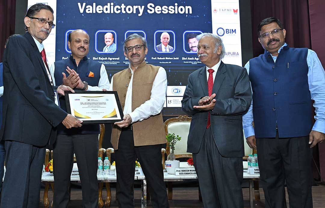 BITS Pilani has been conferred the IMC Gold Award for Excellence in Management Education at the 15th Indian Management Conclave (IMC) 2025, hosted by IIFT. The award was presented by Shri Vineet Joshi, Secretary, Department of Higher Education, and received on behalf of BITS Pilani by Dr. Krishnamurthy Bindumadhavan.