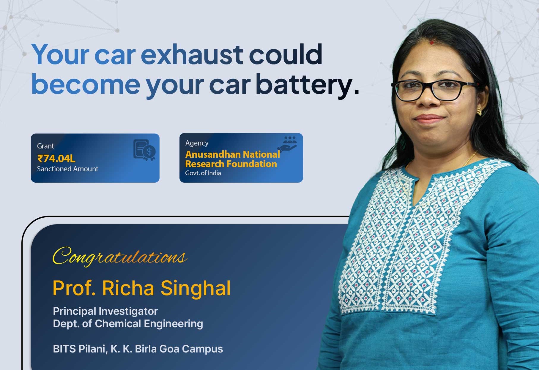 We are pleased to share that Prof. Richa Singhal (Department of Chemical Engineering), BITS Goa, has been awarded an Advanced Research Grant (₹74,04,480 for 3 years) by the Anusandhan National Research Foundation (ANRF), Government of India.