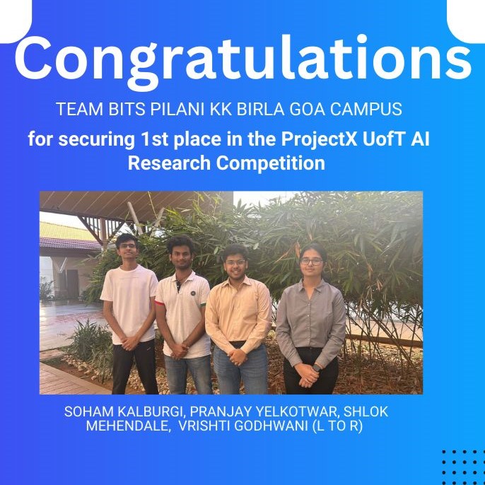 A massive shoutout to Shlok Mehendale, Soham Kalburgi, Vrishti Godhwani, and Pranjay Yelkotwar for securing 1st place in the ProjectX UofT AI Research Competition ProjectX, organised by the University of Toronto AI, is the world’s largest undergraduate machine learning research competition, bringing together 17 top universities from around the globe.