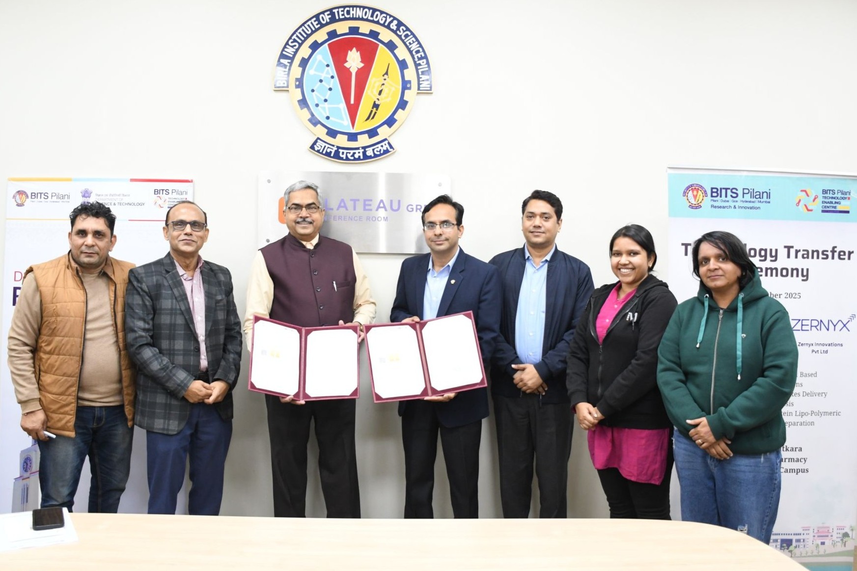Three advanced biopharmaceutical technologies were transferred to Zernyx Innovations Pvt. Ltd., founded by Prof. Deepak Chitkara and Mr. Ajay Patel, in the presence of Prof. Sudhirkumar V Barai, Director, Pilani Campus strengthening the Institute’s innovation-to-market ecosystem.