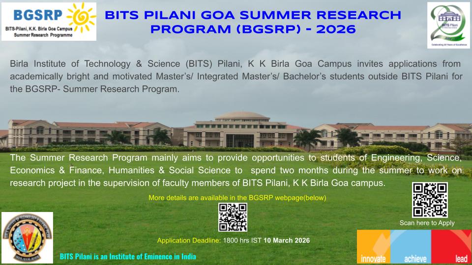 About BITS Pilani Goa campus and BGSRP: Birla Institute of Technology and Science(BITS) Pilani, K K Birla Goa Campus (BITS Goa), an Institute of Eminence in Technology and Sciences, conducts cutting-edge research in the areas of Engineering Computer Sciences and Information Systems, Electrical and Electronics Engineering, Chemical Engineering and Mechanical Engineering), Sciences (Biological Sciences, Chemistry, Mathematics and Physics), Humanities and Social Sciences, Humanities and Social Sciences, Economics and Finance.