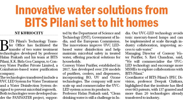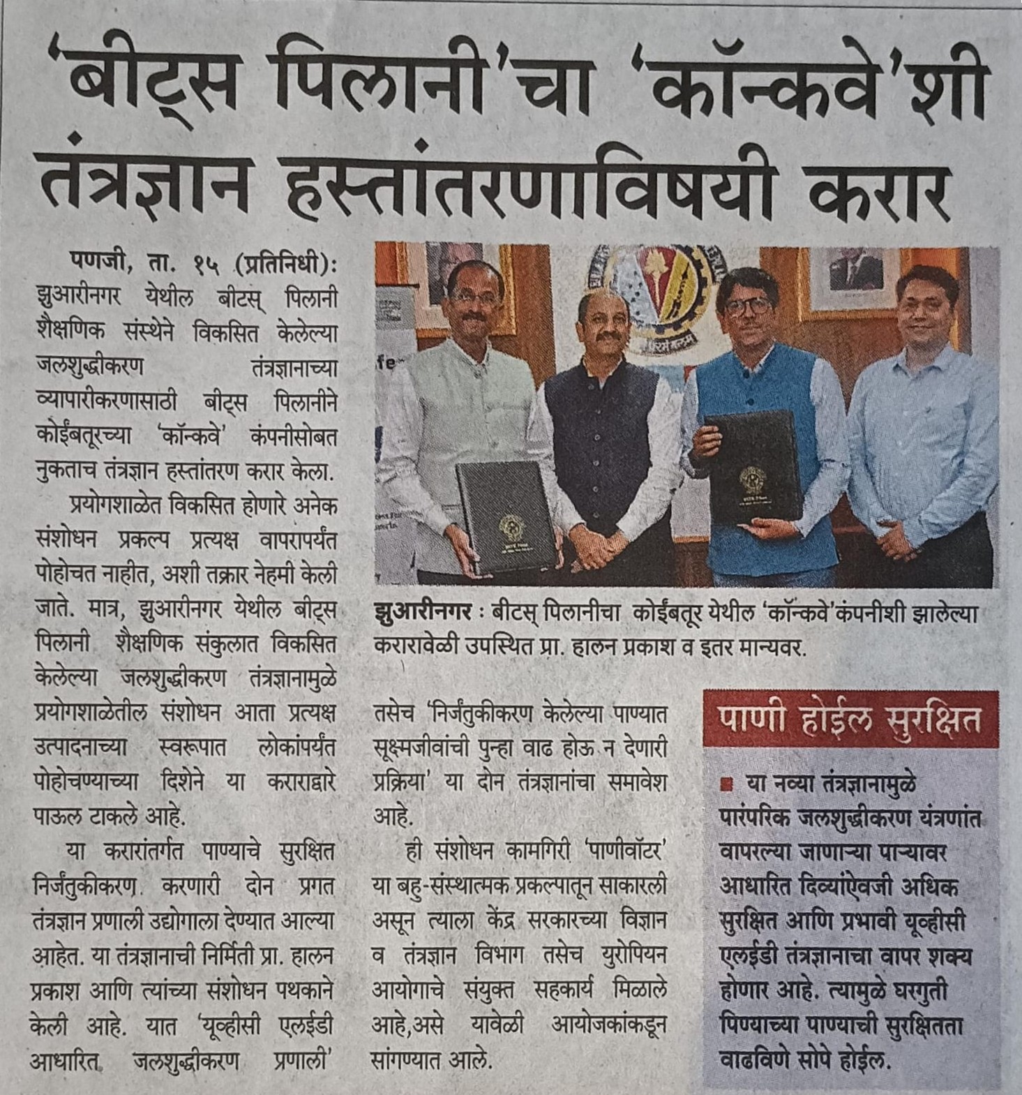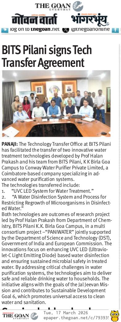 BITS Pilani K.K. Birla Goa Campus Partners with Coimbatore-based Conway Water Purifier Pvt. Ltd. to Transfer Advanced Water Disinfection Technology - Online Media Café 13.03.2026