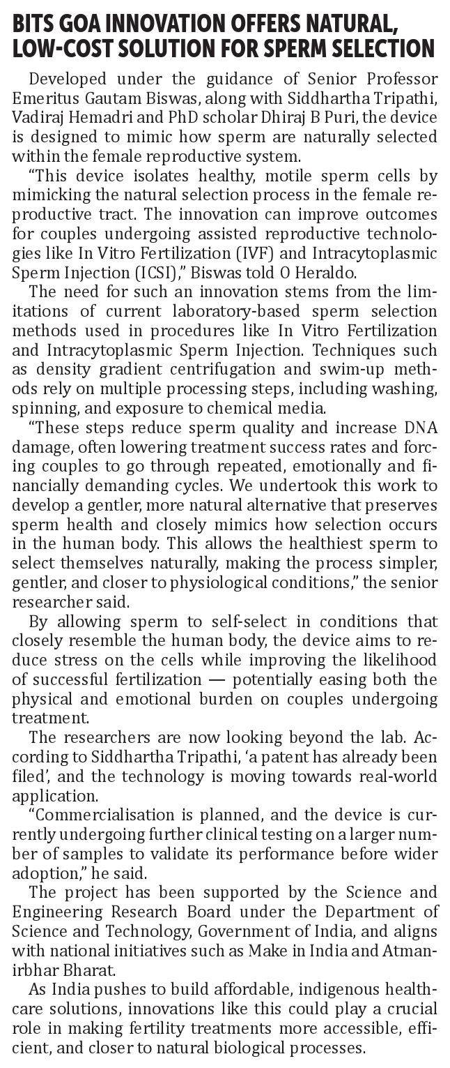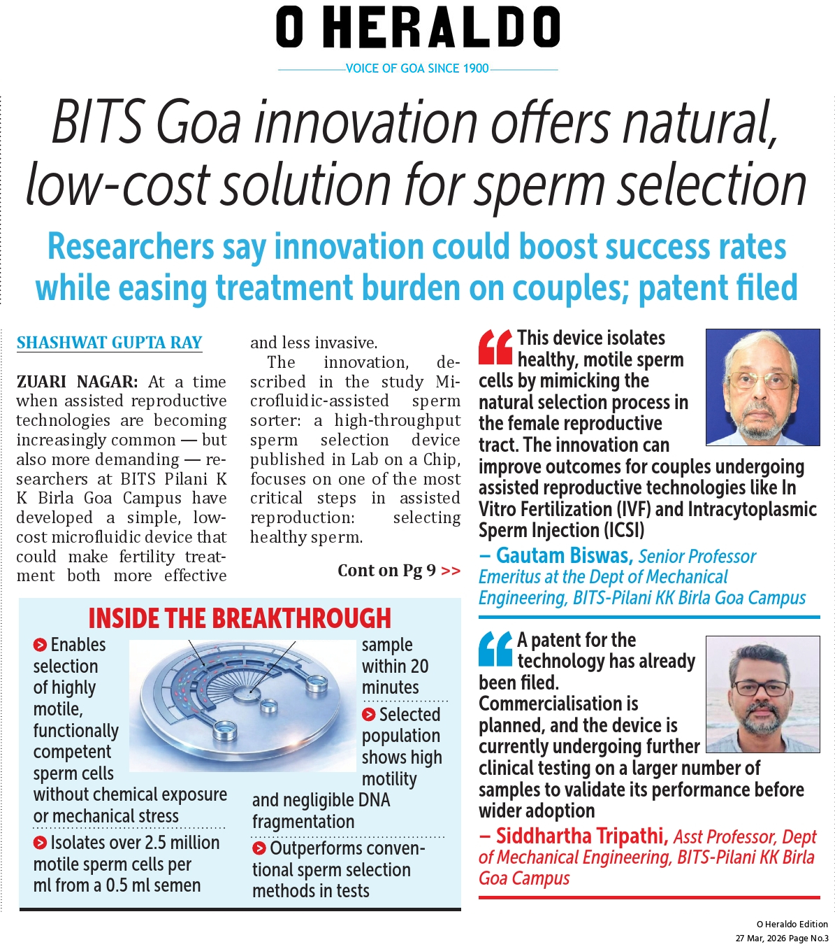 BITS Goa innovation offers natural, low-cost solution for sperm selection - Herald 27.03.2026 - 2