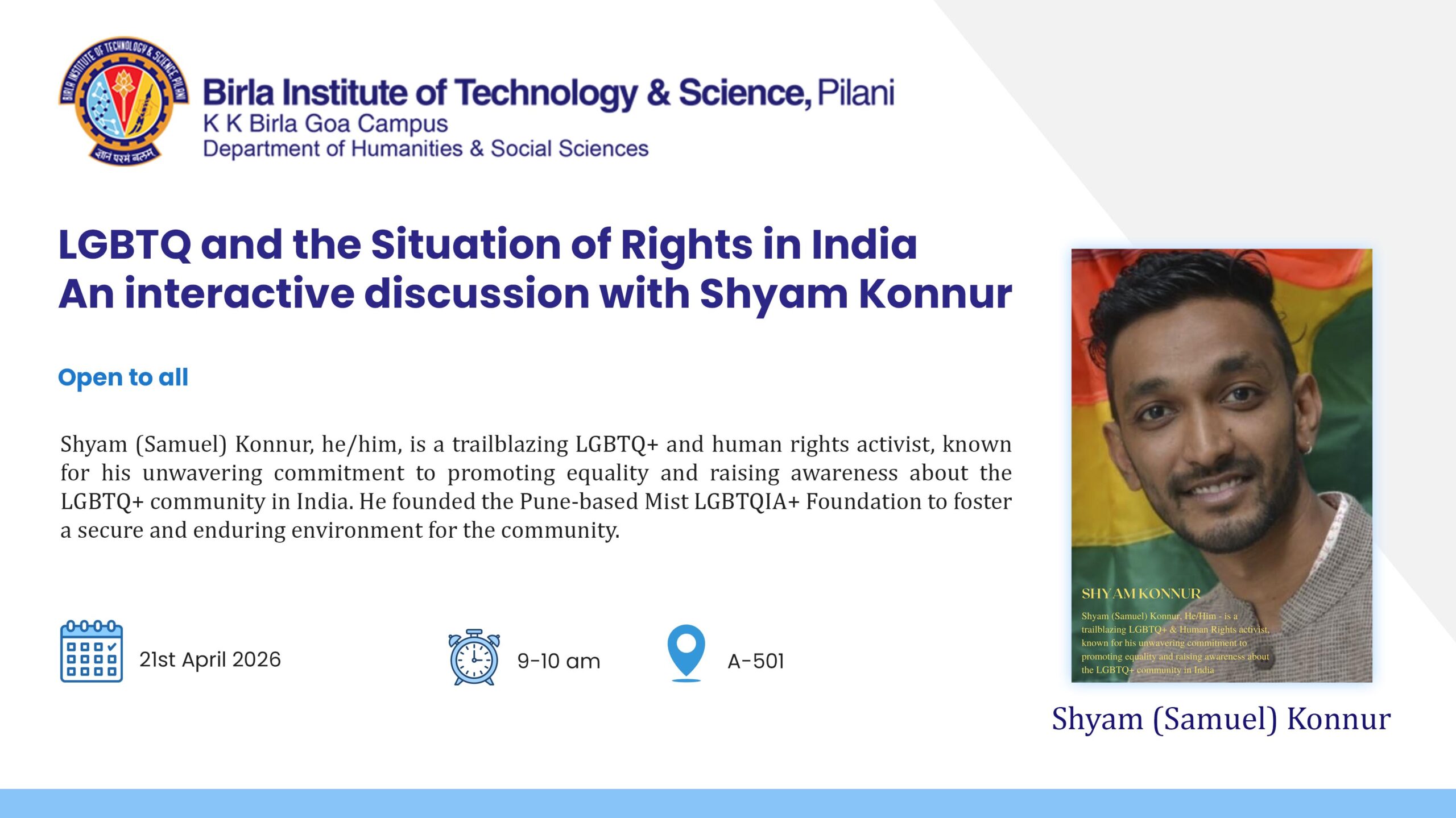 18 April, 2026LGBTQ and the Situation of Rights in India. An interactive discussion with Shyam Konnur.