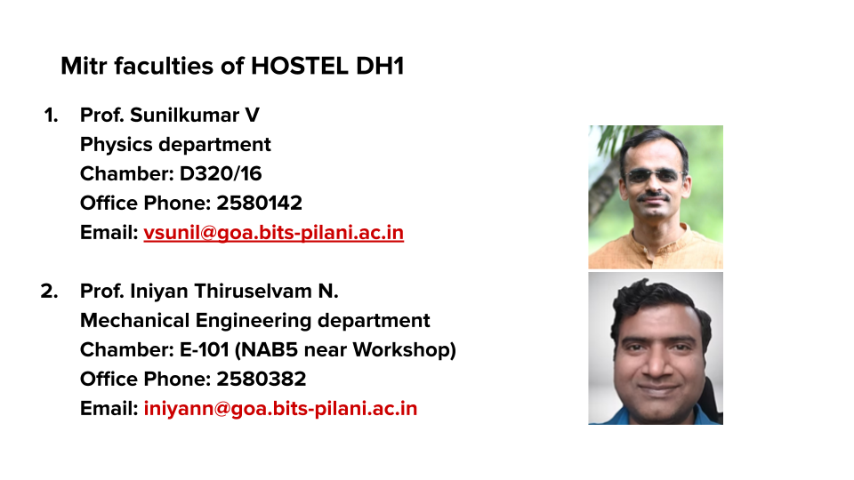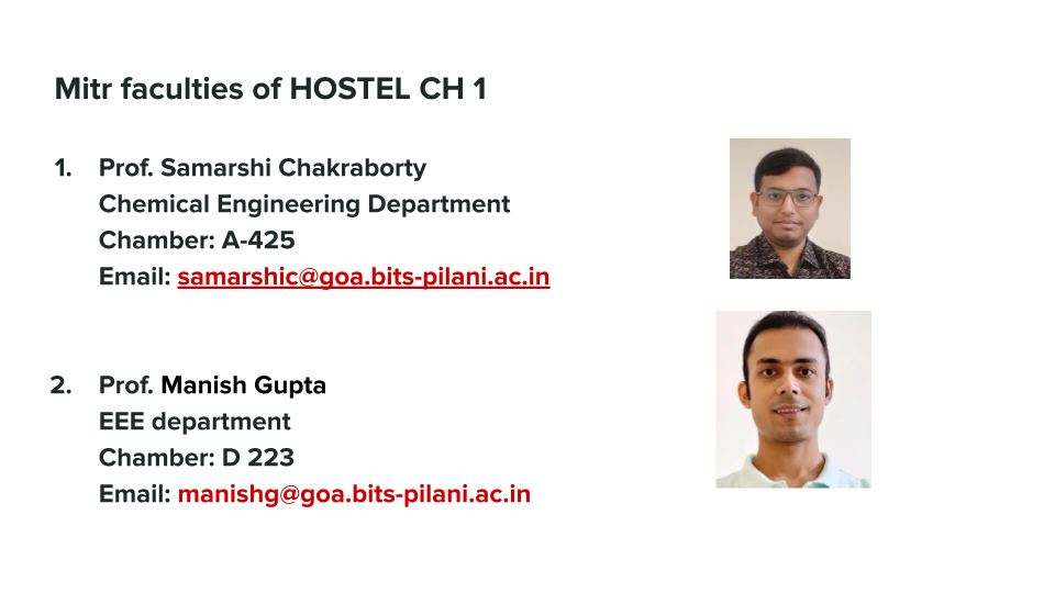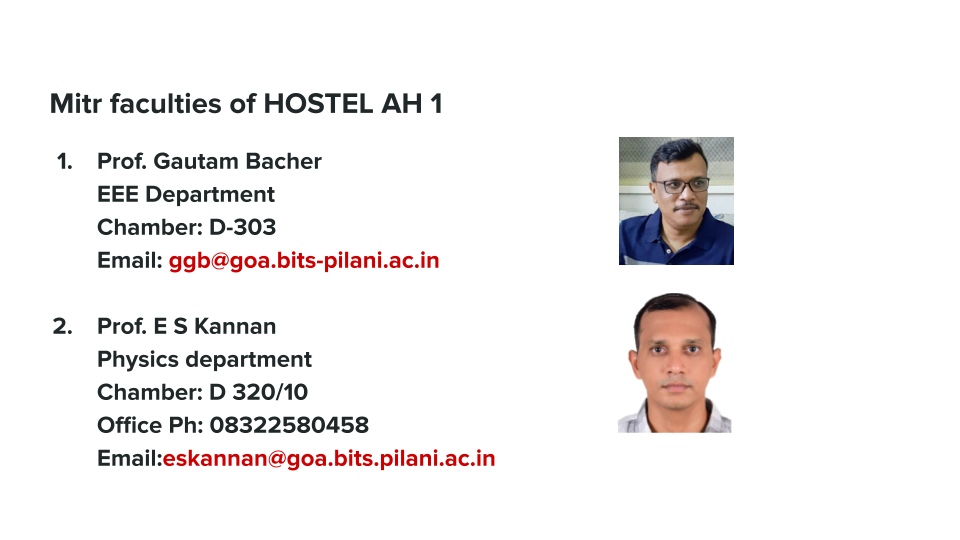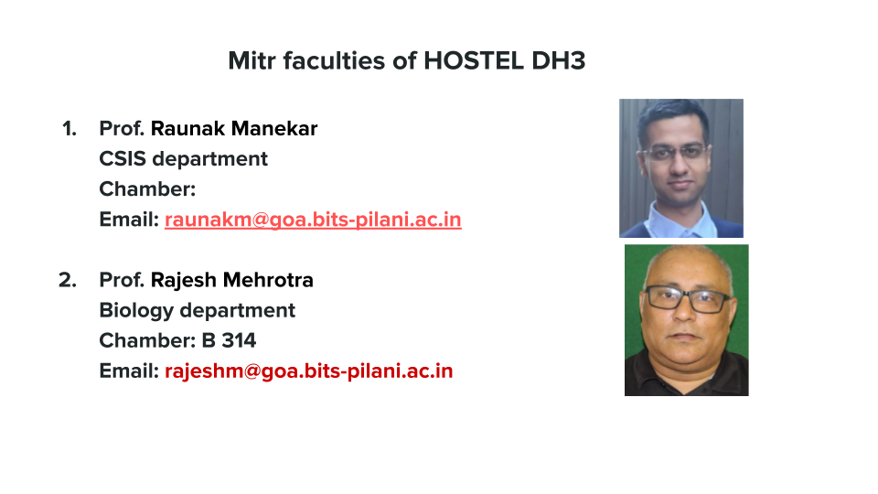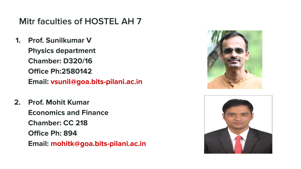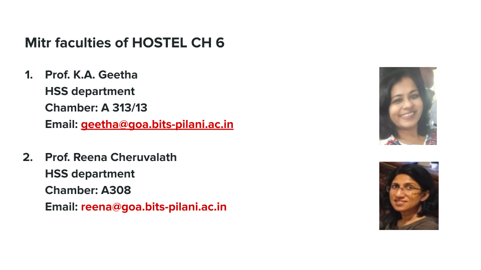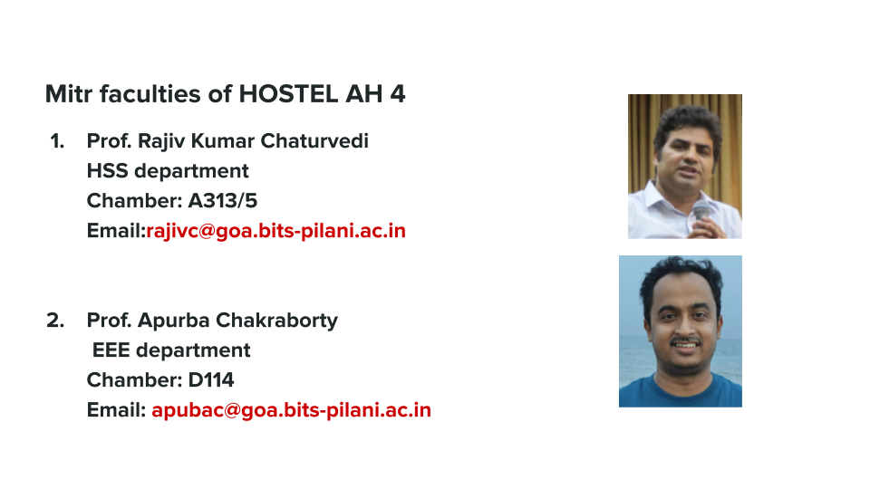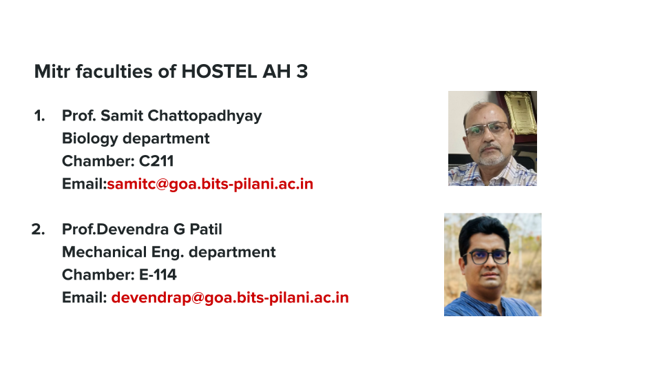 You can find the list of Mitr faculty for each hostel below. Write to us at <mitr@goa.bits-pilani.ac.in>