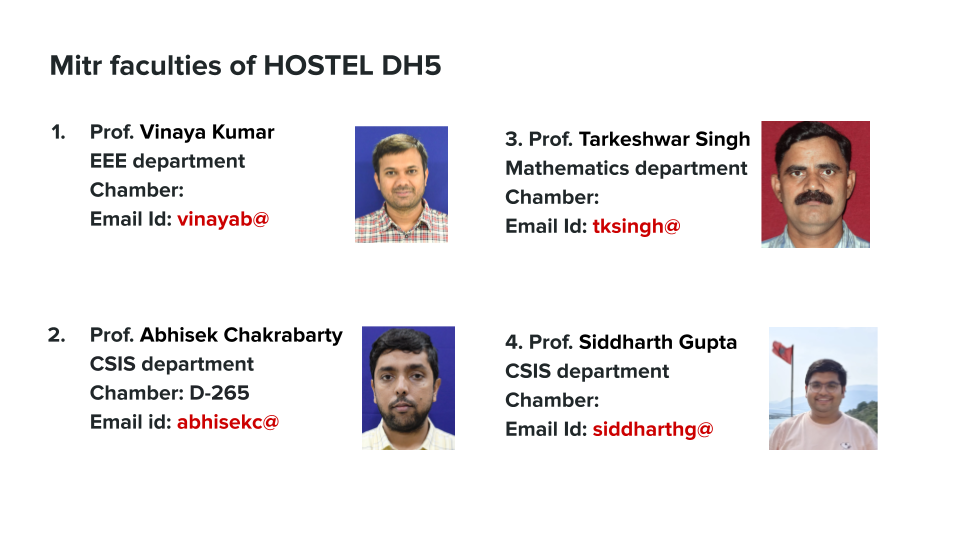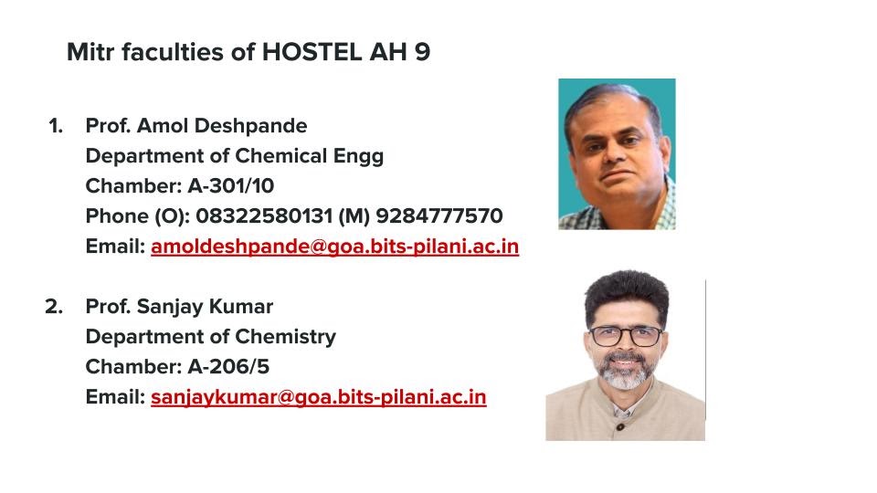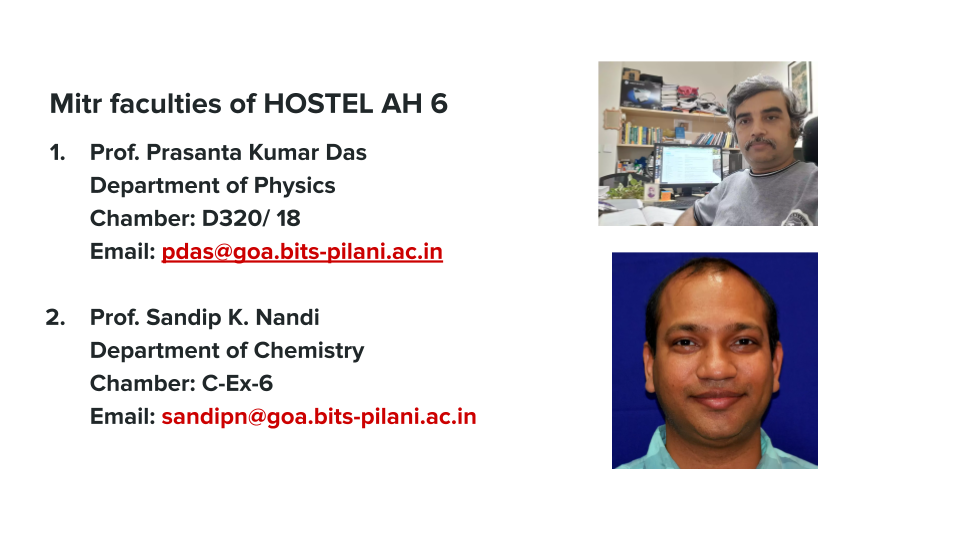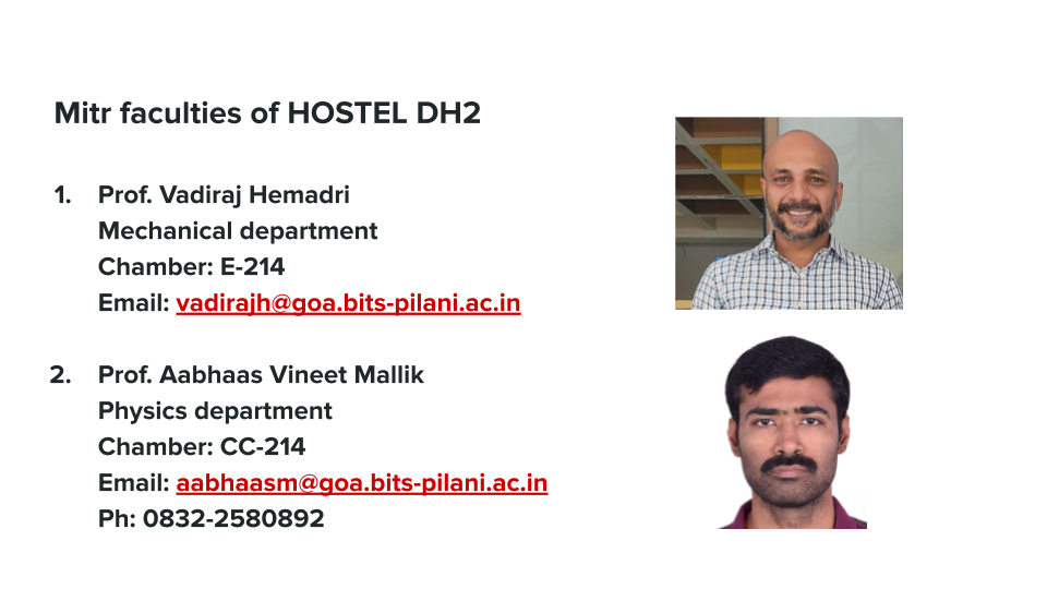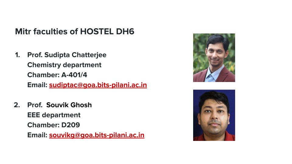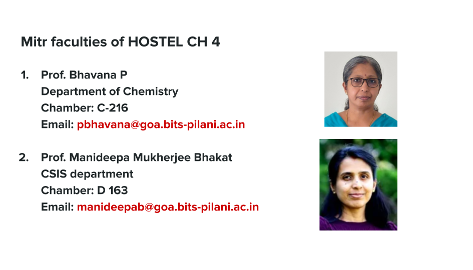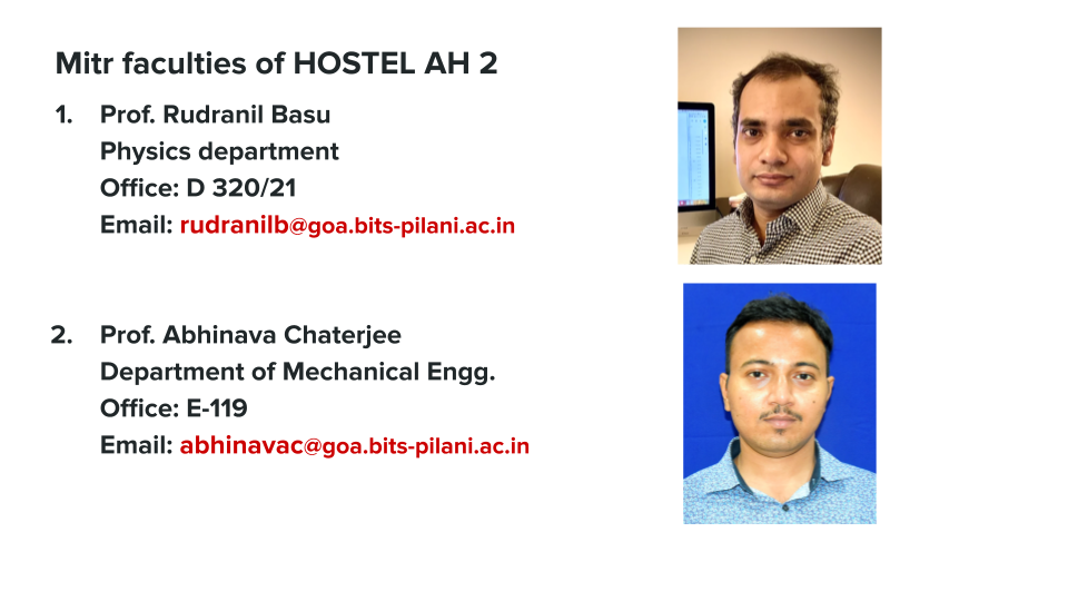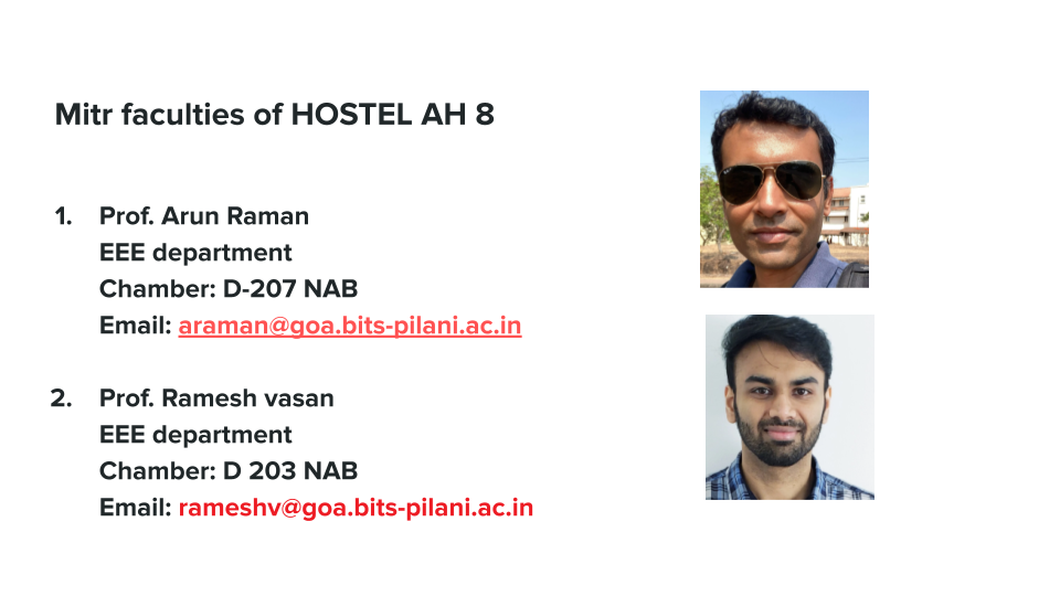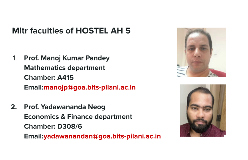 You can find the list of Mitr faculty for each hostel below. Write to us at <mitr@goa.bits-pilani.ac.in>