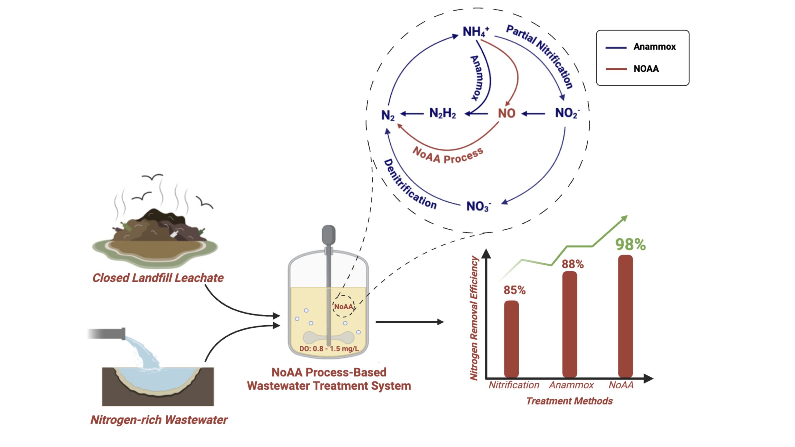 The NOTA process is an innovative biological treatment technology designed to achieve highly efficient nitrogen removal from challenging wastewater streams such as landfill leachate (CLL) and other nitrogen-rich effluents. Unlike conventional anammox systems that rely on nitrite (NO₂⁻) and generate toxic hydrazine intermediates, NOTA introduces a nitric oxide (NO)-dependent pathway that is both energetically favorable (ΔG = -1784 kJ/mol) and environmentally safer. Operating under reduced dissolved oxygen levels (0.8–1.5 mg/L) with activated sludge as the inoculum, NOTA ensures partial nitrification to provide substrates while selectively suppressing nitrite-oxidizing bacteria, thus reducing competition and nitrate accumulation. By bypassing hydrazine formation and employing NO as the electron acceptor, NOTA minimizes toxicity, enhances microbial stability, and conserves energy, enabling >98% ammoniacal nitrogen removal even under complex leachate conditions. The process also lowers aeration energy demand, simplifies operation, and supports microbial adaptation to high-strength wastewaters. With its combination of superior energy efficiency, reduced toxicity, and robust nitrogen removal, NOTA represents a breakthrough advancement for sustainable, cost-effective treatment of recalcitrant nitrogenous waste streams.