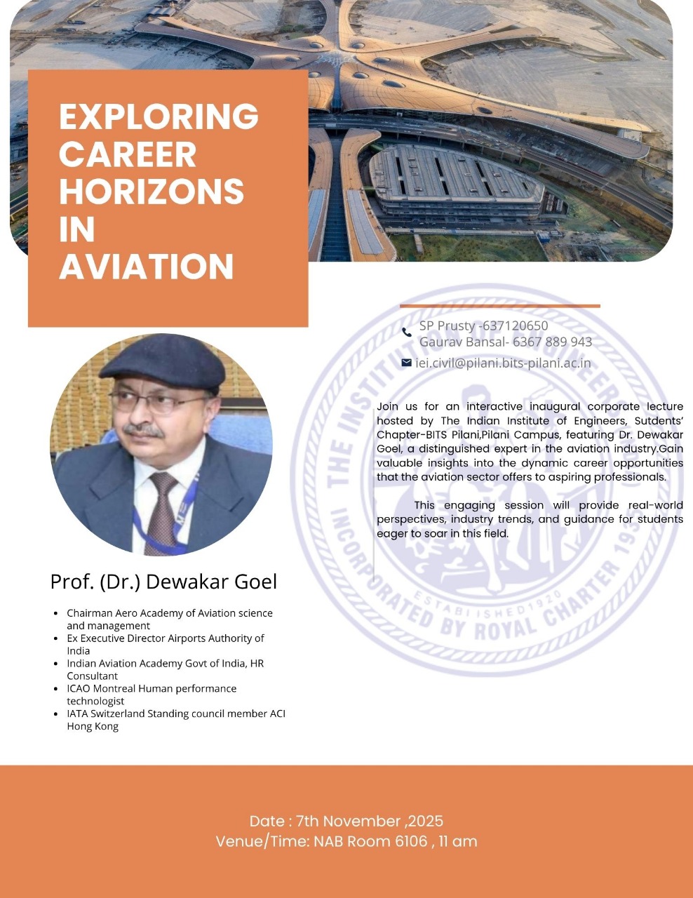 We are pleased to invite you to an interactive inaugural corporate lecture titled โ€œExploring Career Horizons in Aviationโ€, hosted by The Indian Institution of Engineers (IEI) Studentsโ€™ Chapter, BITS Pilani.