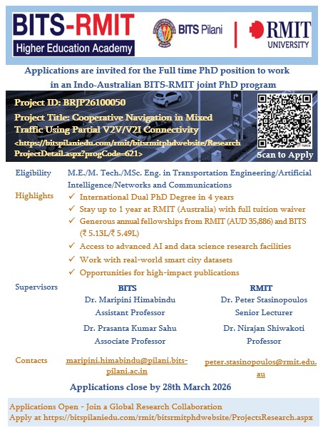 Applications are now open for a Fully Funded PhD Position under the BITS–RMIT International Joint PhD Program in the area of Cooperative Navigation in Mixed Traffic using Partial V2V/V2I Connectivity.