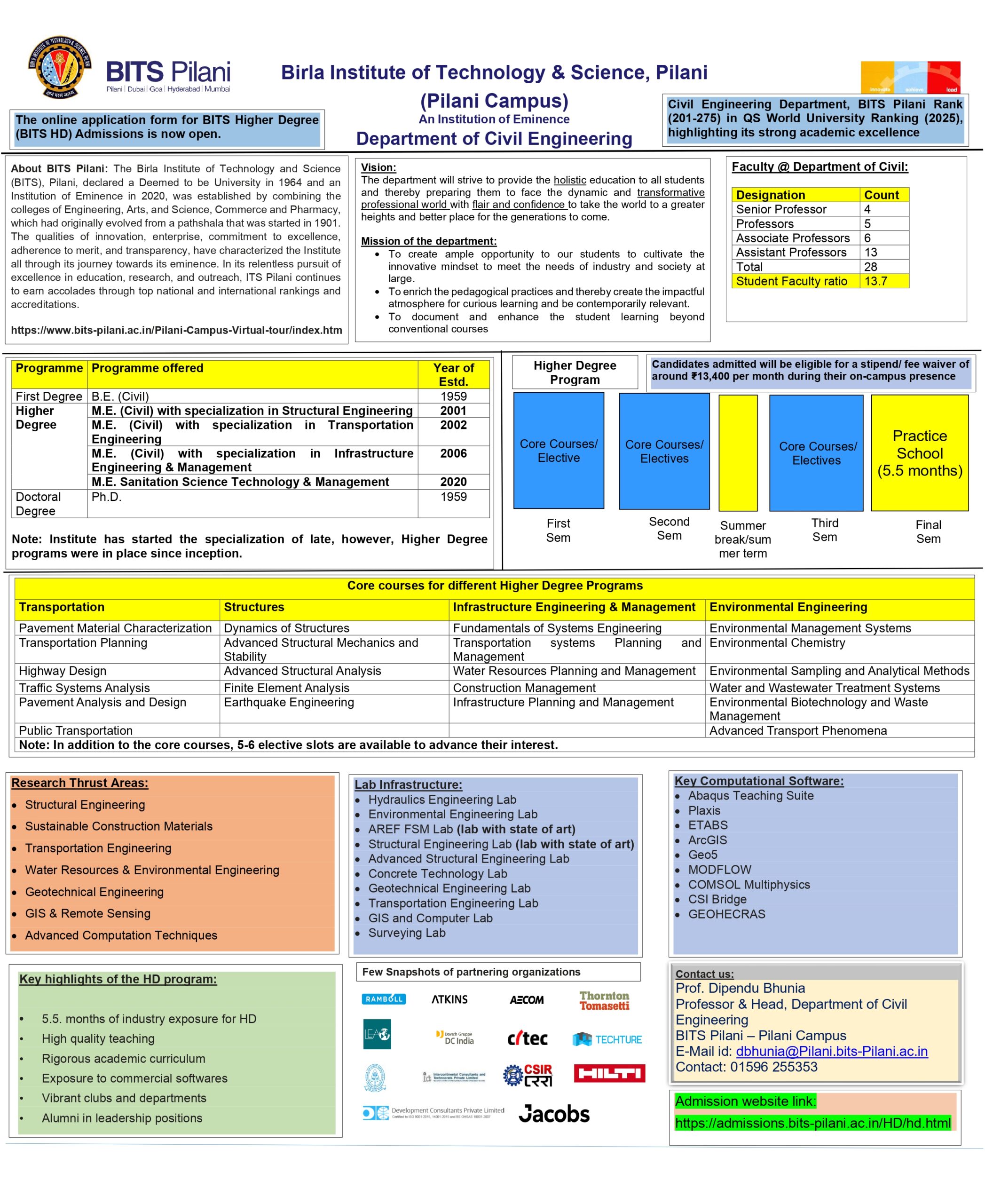 The Department of Civil Engineering at BITS Pilani (Pilani Campus) – an Institution of Eminence – has opened applications for its Higher Degree (HD) programs. If you are looking to advance your career through world-class education, research, and industry exposure, this is a great opportunity.