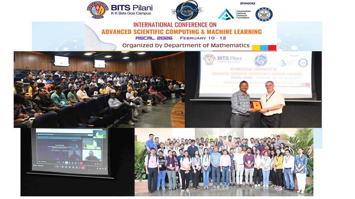 The Department of Mathematics at BITS Pilani, K K Birla Goa Campus successfully hosted the International Conference on Advanced Scientific Computing & Machine Learning (ASCML 2026) from 10th to 12th February 2026. The three-day international conference brought together leading researchers, academicians, industry experts, and students for engaging discussions on the latest advancements in scientific computing and machine learning. More than 120 students, research scholars, and faculties from different parts of India and a few from abroad participated in the conference at the venue, while 25 participated virtually. The conference was sponsored by government agencies such as the Anusandhan National Research Foundation (ANRF) and the Defence Research and Development Organisation (DRDO).